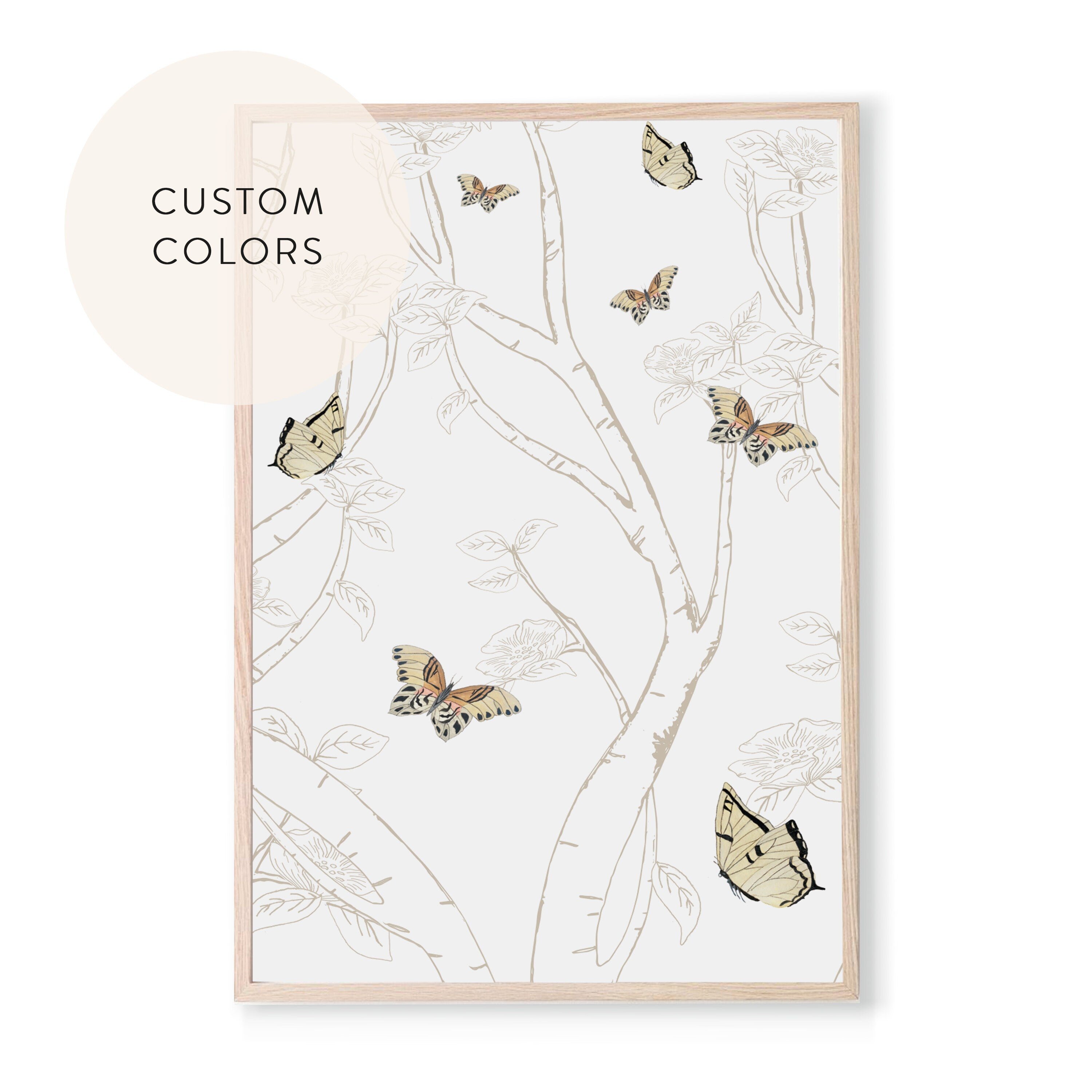 Beautiful Watercolor Butterflies with hand-drawn trees trees and flowers Enjoy choosing a color that fits your decor and your style. This custom color wall print allows you to decide on the color you like.