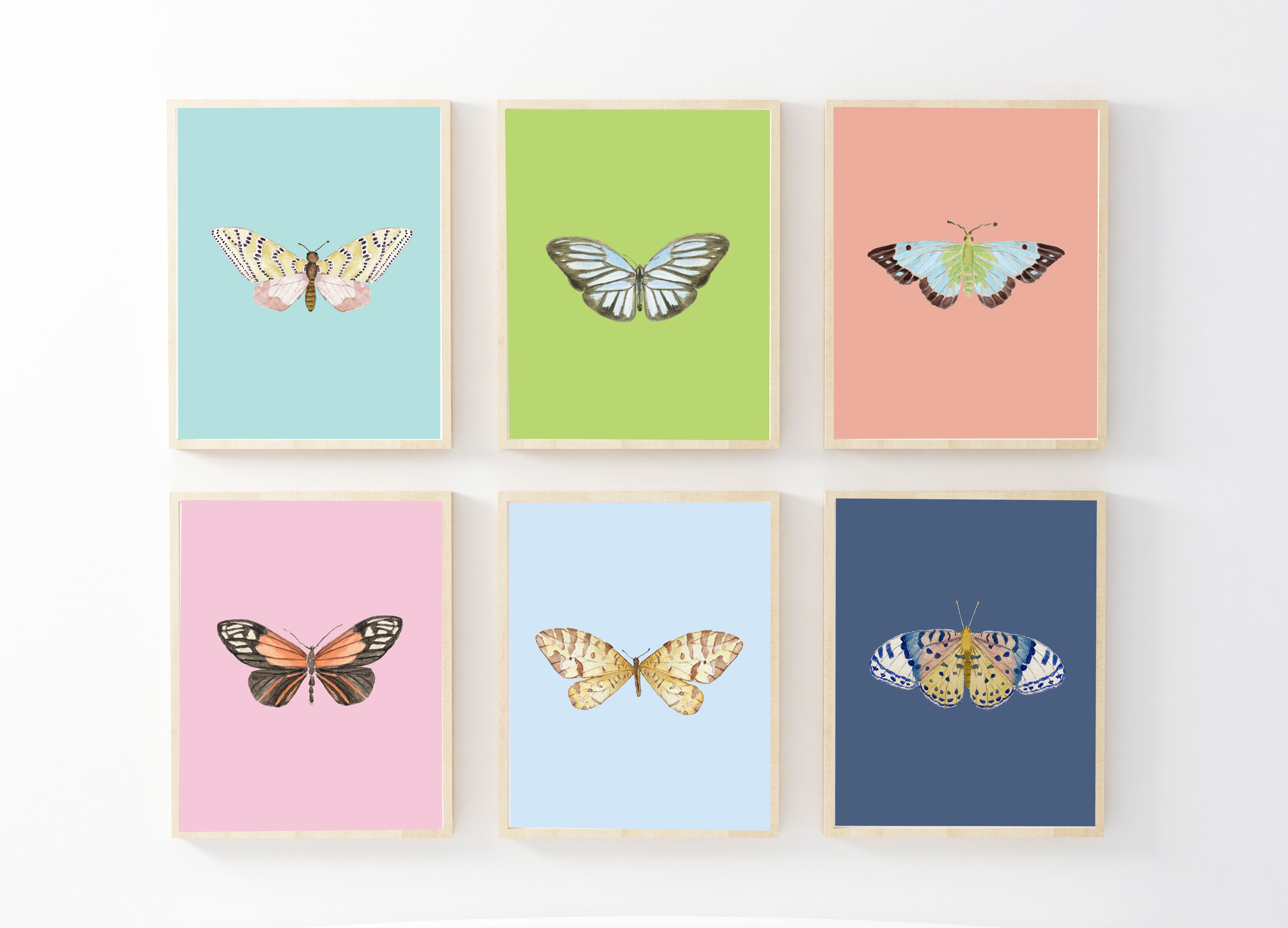 Pair of Butterfly and Bird Chinoiserie Watercolor Prints