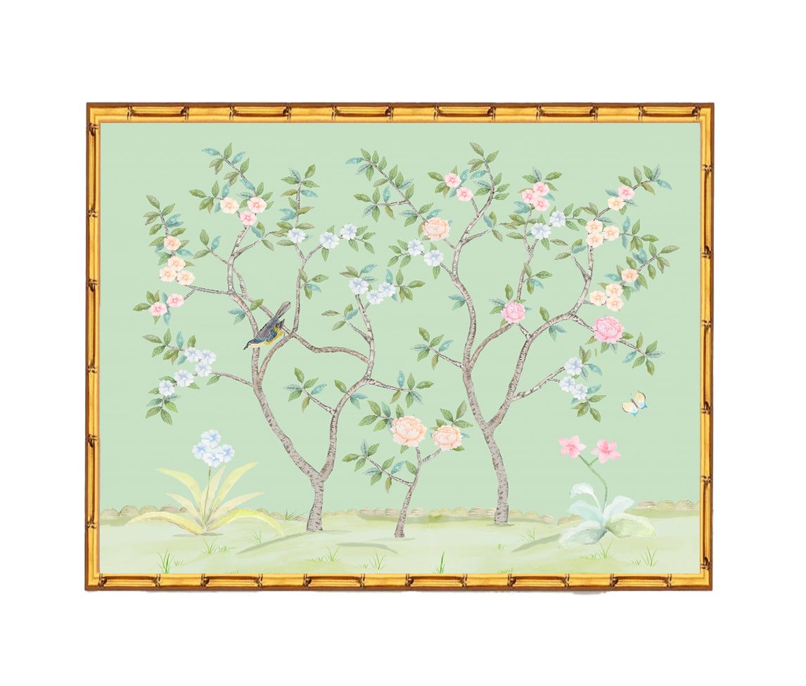 Chinoiserie Landscape Bird and Butterflies Print | Custom Color Botanical Art