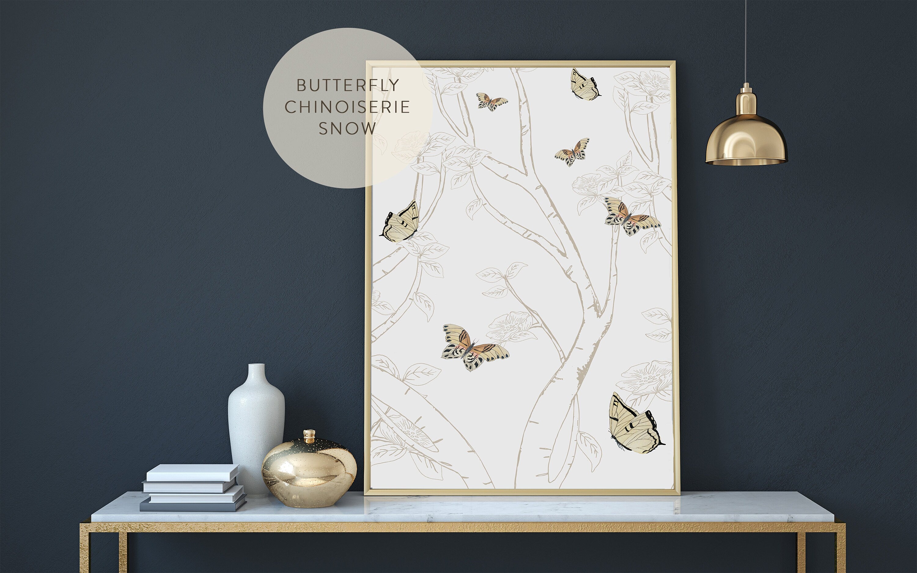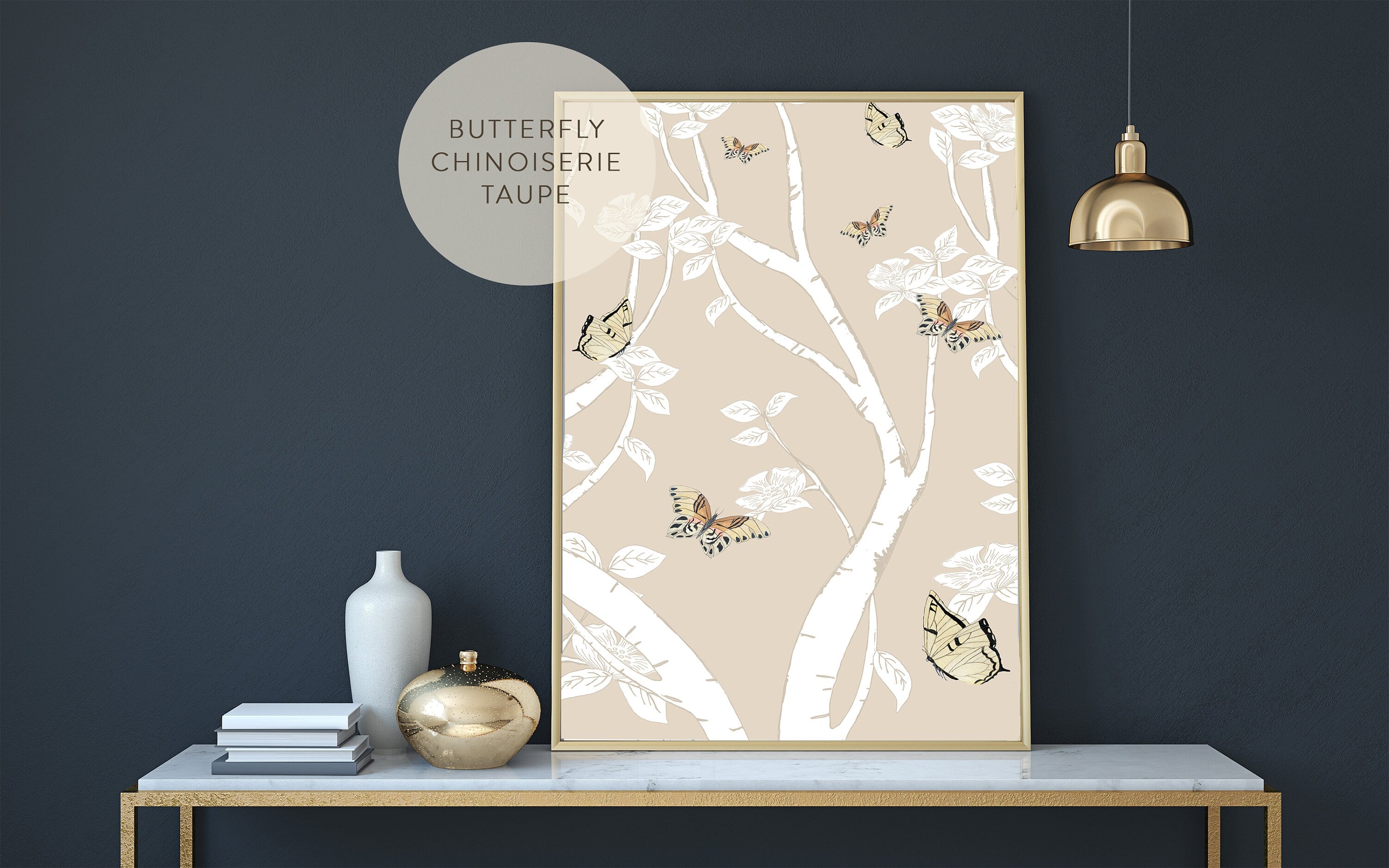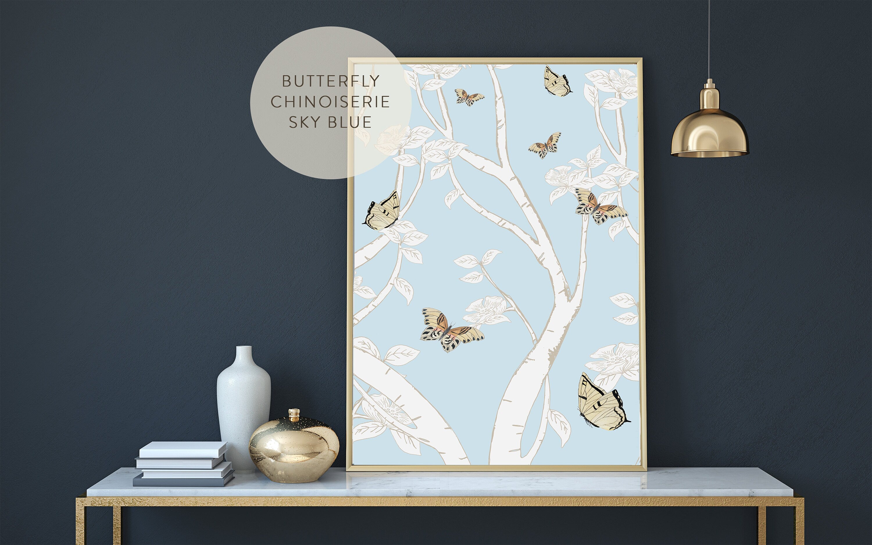 Chinoiserie Landscape Bird and Butterflies Print | Custom Color Botanical Art