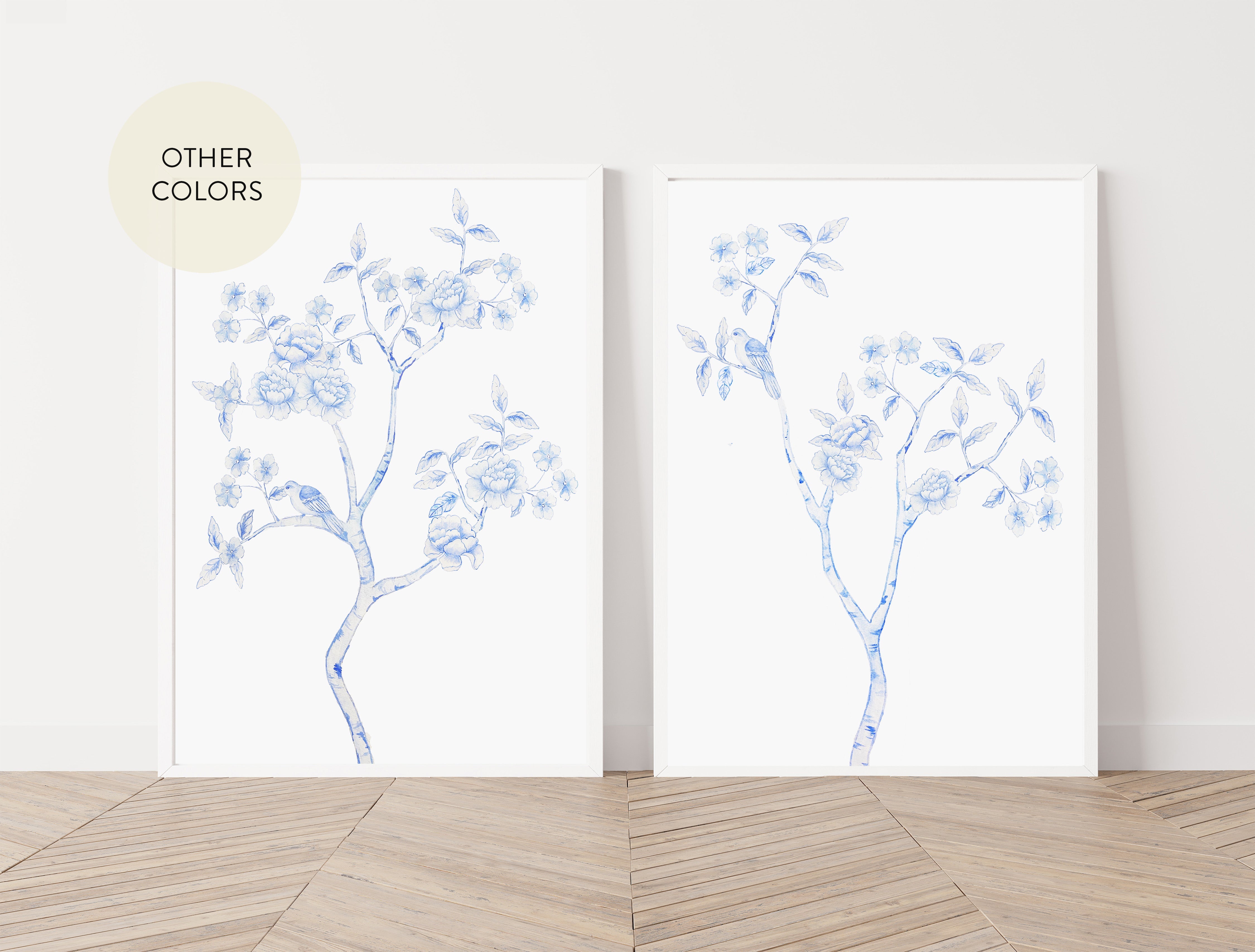 Chinoiserie Bird Peony Flower Art Print | Custom Color Chinoiserie | Watercolor chinoiserie