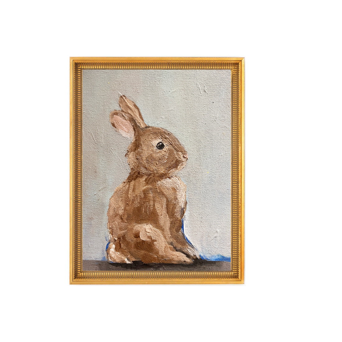 " 'Serenity in Stillness' captures a heartwarming moment of nature's innocence and tranquility on canvas or fine art print. In this delicate portrayal, a charming bunny sits in serene repose, its soft, velvety fur beautifully rendered in warm, earthy tones.