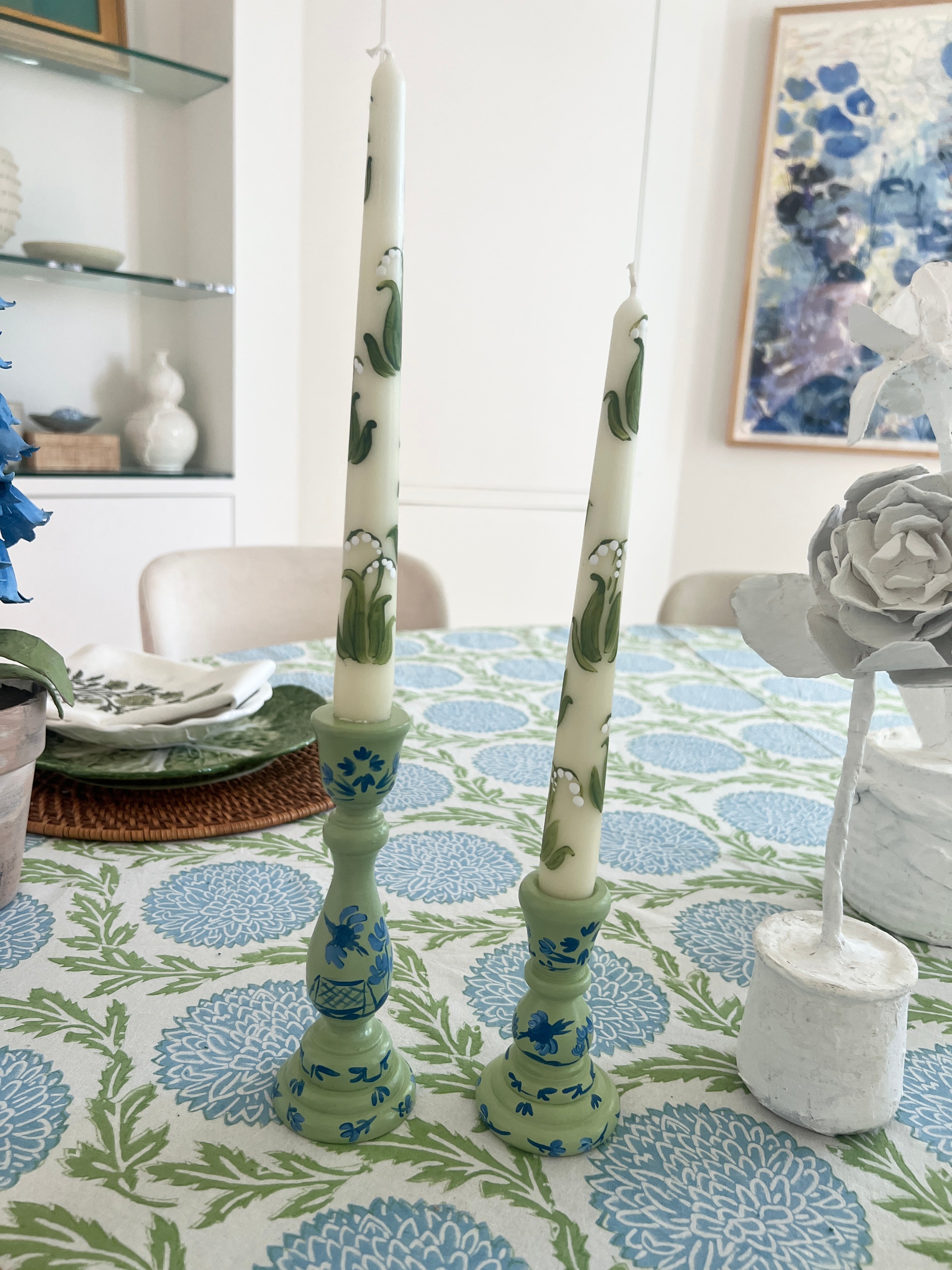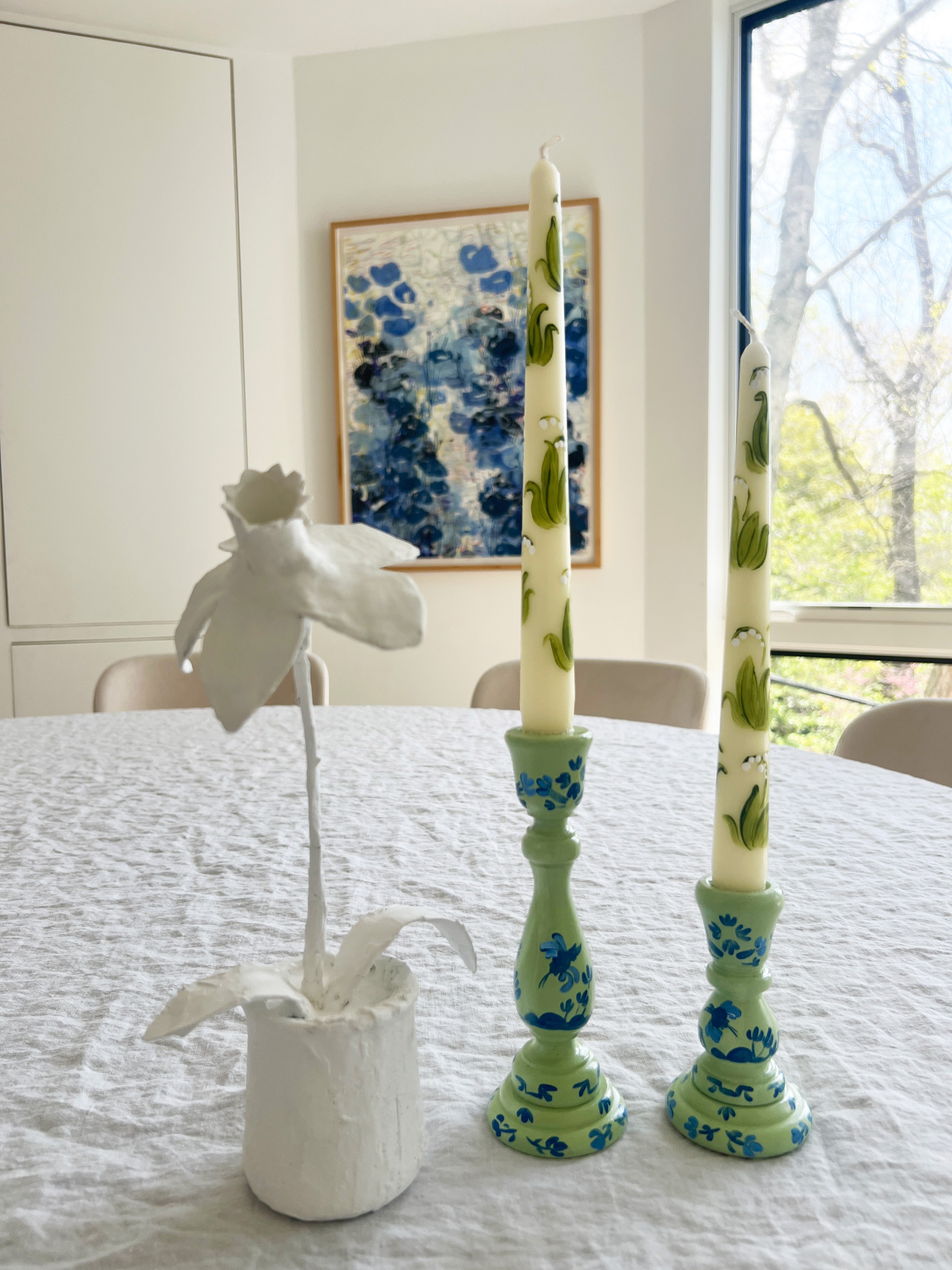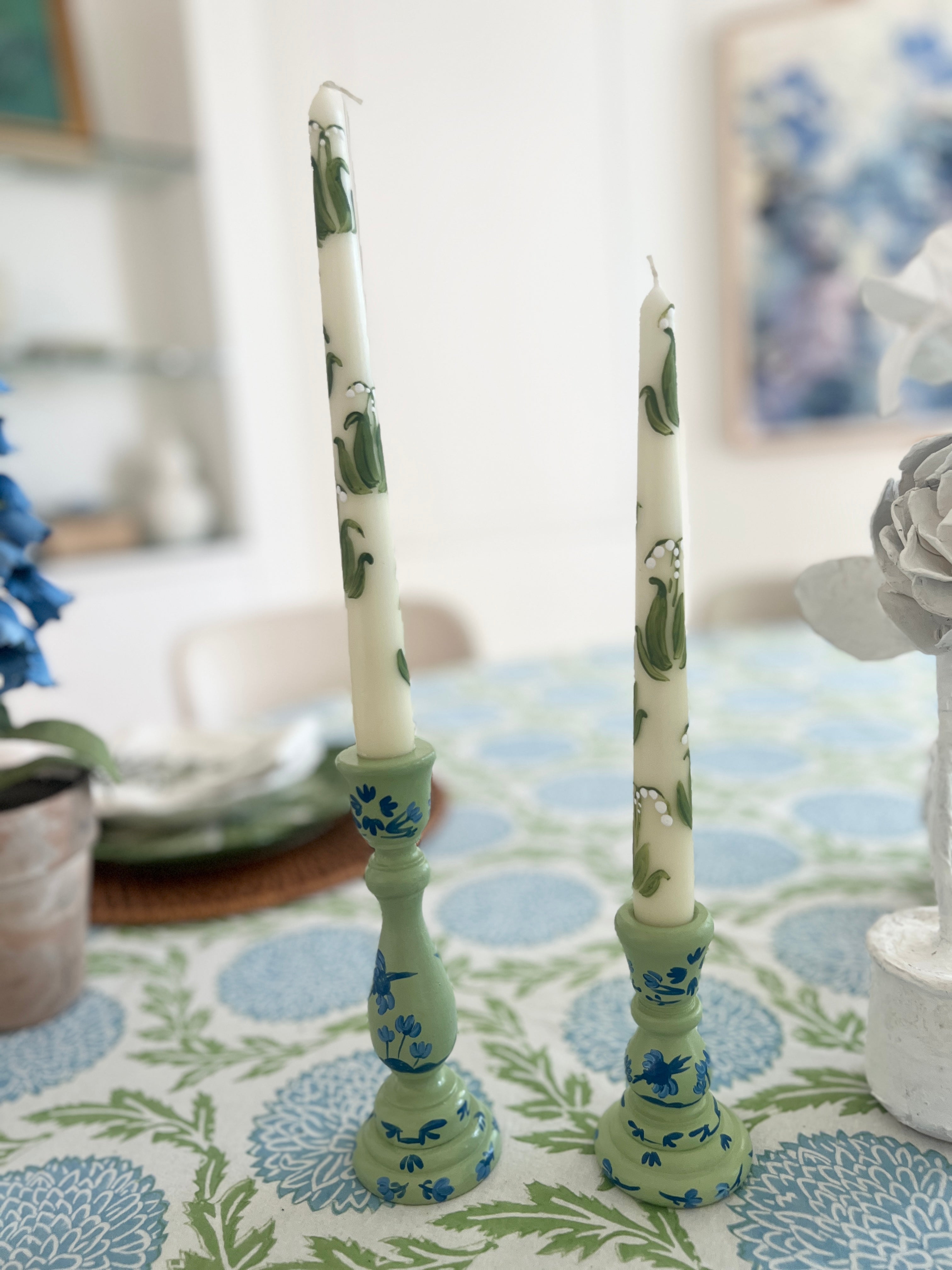Lovely hand painted candleholders. Each candleholder includes artist signature from Sweet Pea + Whimsy and every candleholder is unique since it is hand painted. Perfect for a unique gift.