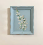 Add a touch of charm to your home with our Canterbury Bells in Blue painting. This charming piece is encased in a lovely blue scalloped vintage frame. The cool blue background creates a tranquil backdrop with white Canterbury bells.