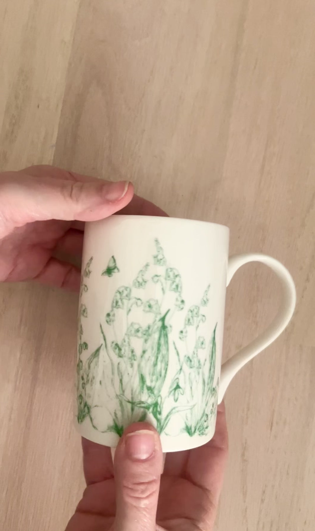 ☕ Lily of the Valley Mug – A white ceramic cup adorned with a hand-drawn green lily of the valley illustration, complete with fluttering butterflies inside the rim for a whimsical surprise with every sip.