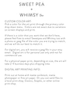 DIGITAL ART PRINTING INFO: Print out at home with matte cardstock, matte photopaper or fine art paper. Or you can send files to a local print shop, Costco, Staples, or other online print shop. For digital art print, you will receive within 24-48 hours, and you will receive the following JPEG files in your Etsy email: 8x10 inch 11x14 inch 16x20 inch 20x24 inch If there is a different size, please email Sweet Pea and Whimsy too.