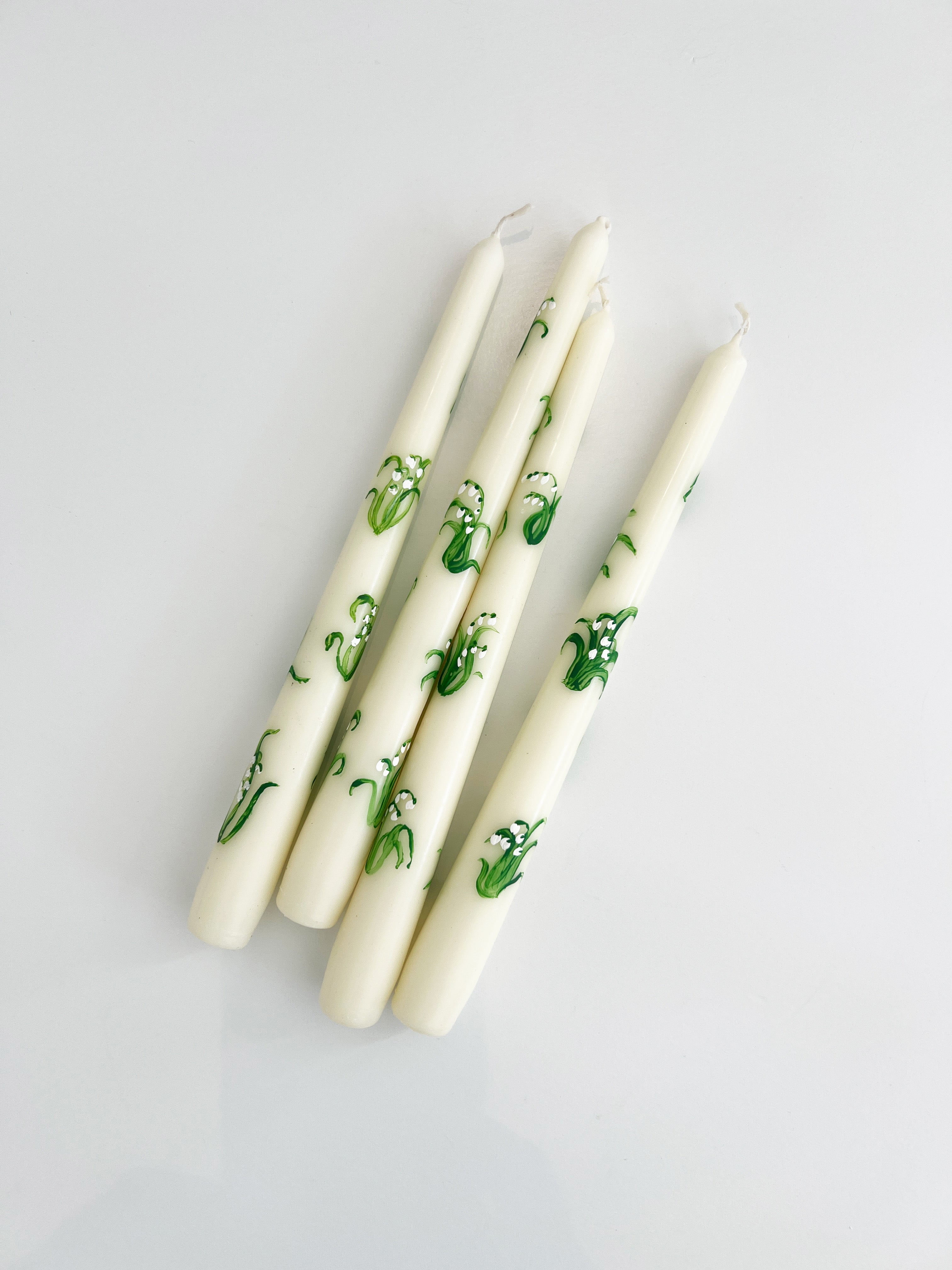 Beautiful hand-painted lily of the valley tapered unscented candlesticks