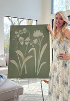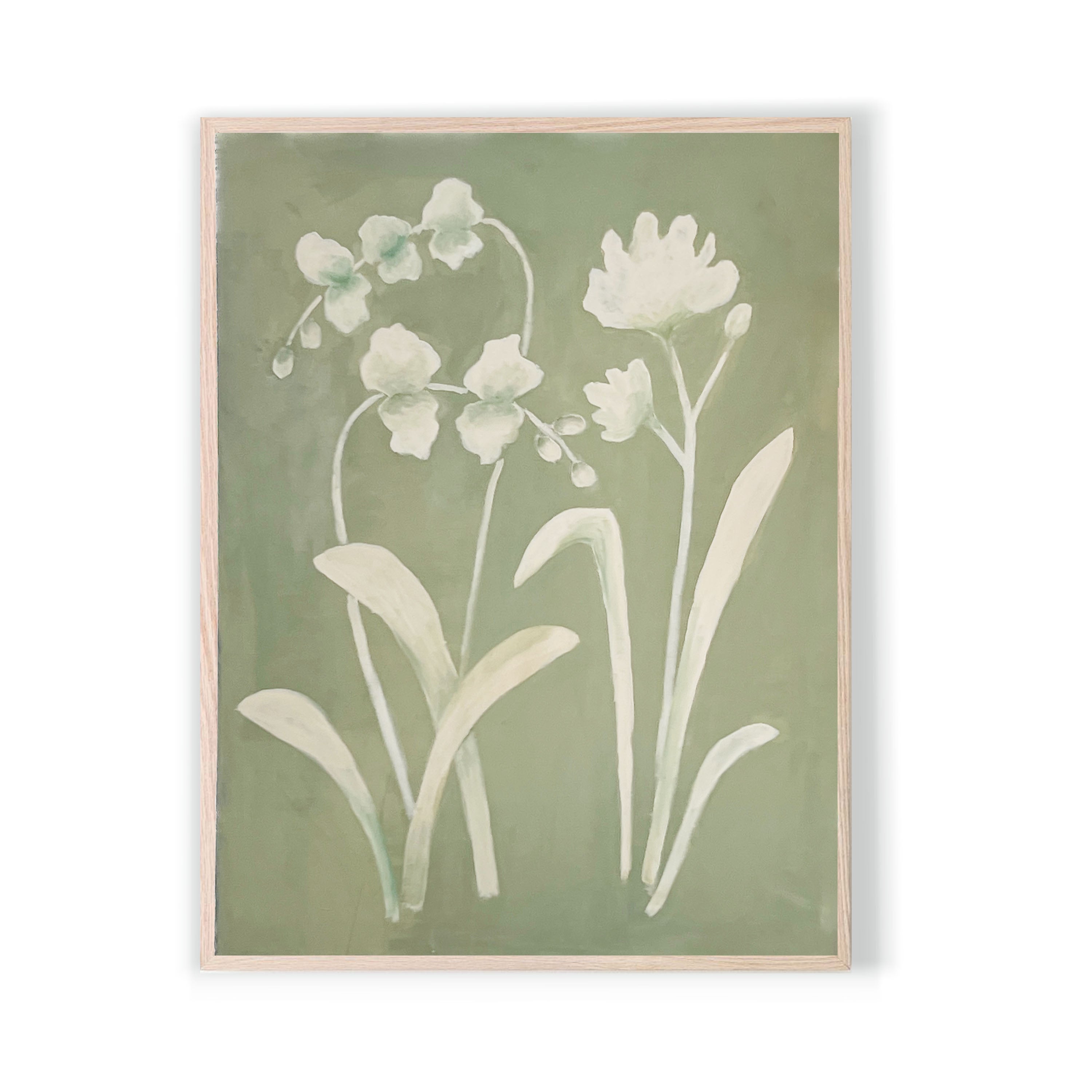 Cradled within an expanse of sage hues, the ivory orchid blooms in silent splendor, a testament to nature.